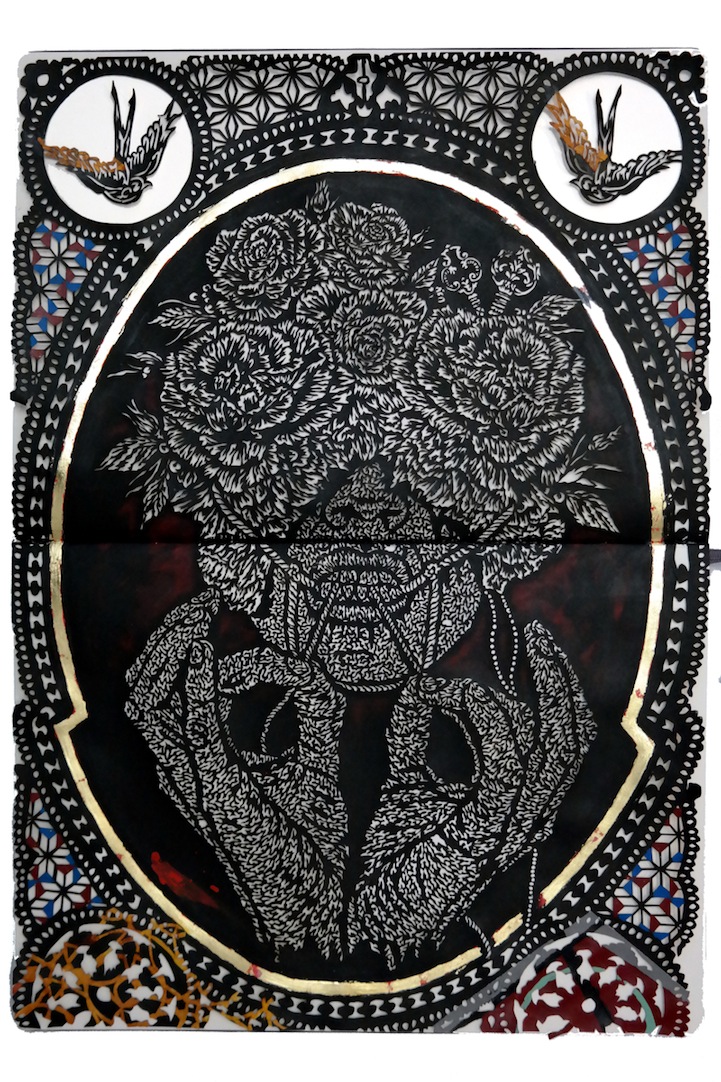 El papel es un material noble, dice Aurel Rubbish, un ex músico electrónico y artista de graffiti. Durante los últimos cuatro años, este hombre francés de 33 años de edad, se ha dedicado al delicado arte de cortar papel. Inspirado por el arte urbano, el diseño de tatuajes y el movimiento pop americano, Rubbish talla intrincados diseños de encaje con poco más que un cuchillo, laminas de oro, pegamento y, por supuesto, el propio papel.