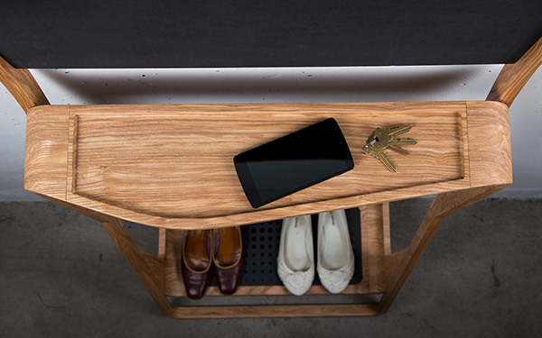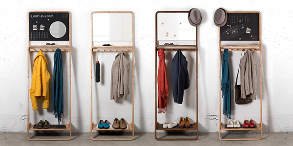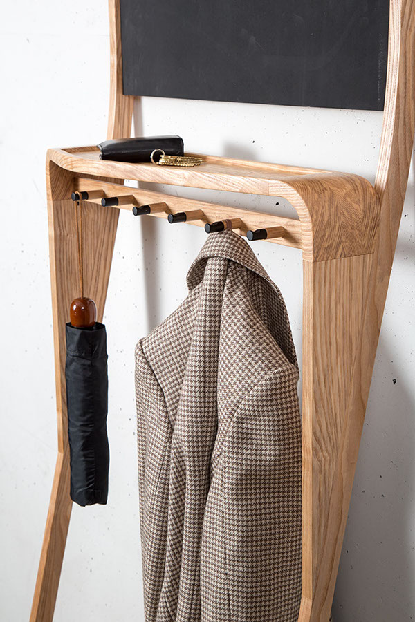 The Leaning Loop es un organizador vertical de madera maciza. Es una percha para la ropa, una zona perfecta para dejar las llaves, gafas de sol e incluso la cartera. También es un espacio para colocar los zapatos, que uno más utiliza, y el rincón donde apuntar diferentes mensajes que uno no debe olvidar.