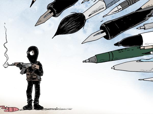 David Pope, dibujante en Australia, también hace su propio homenaje a lo ocurrido en la sede de Charlie Hebdo: («Él dibujo primero»)
