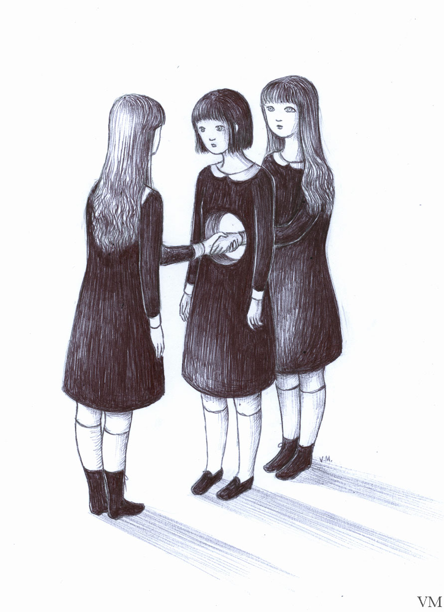 Virginia Mori estudió Ilustración y Animación en el Instituto Nacional de Arte de Urbino (Italia). Virginia dibuja escenas en blanco y negro a lápiz y boli, consiguiendo resultados extraños e incluso tétricos pero nunca alcanza lo horripilante. Para saber más sobre la artista y su obra hacer click aquí.