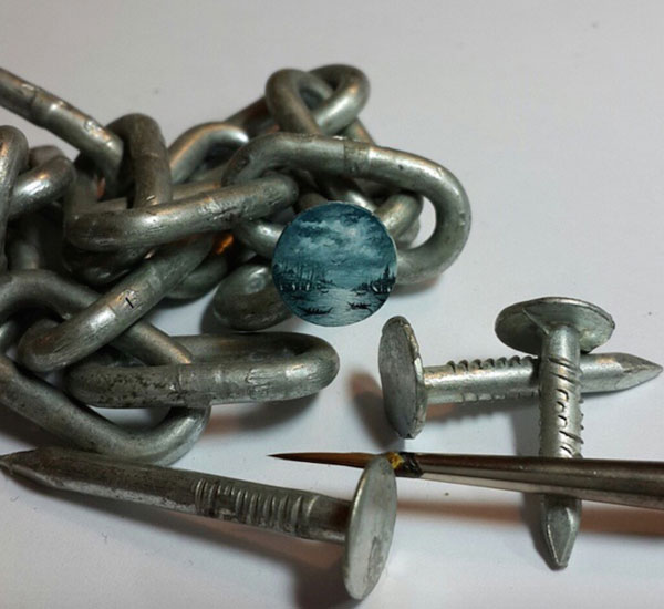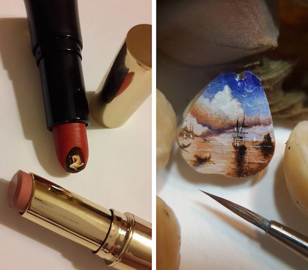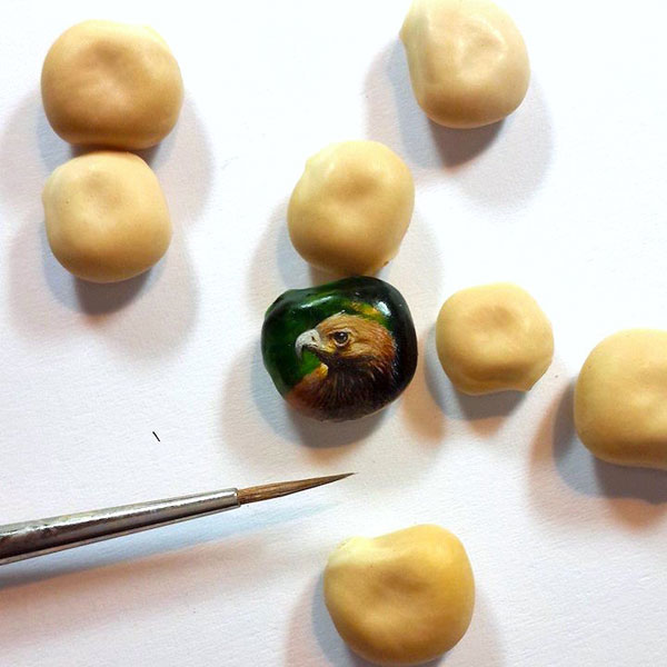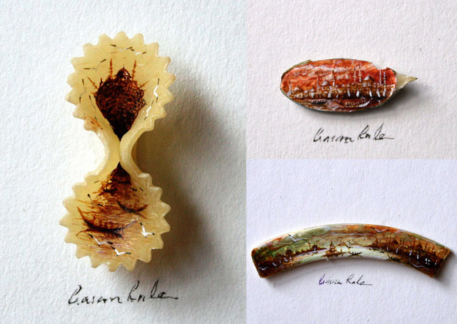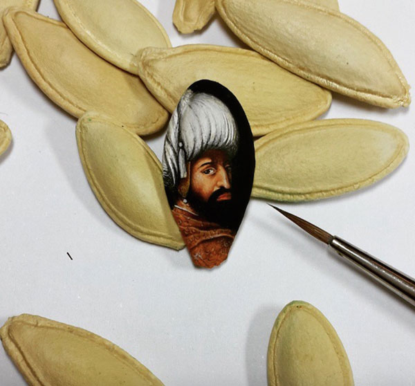 El artista turco Hasan Kale se caracteriza por hacer micro-arte en objetos tan diversos que la lista va desde pipas, cacahuetes, macadamias, piedras, pintalabios, tornillos, cerillas, pasta y hasta mariposas. (Es obvio que su catalogo de «lienzos diferentes» es casi infinito y no voy a nombrarlos todos)