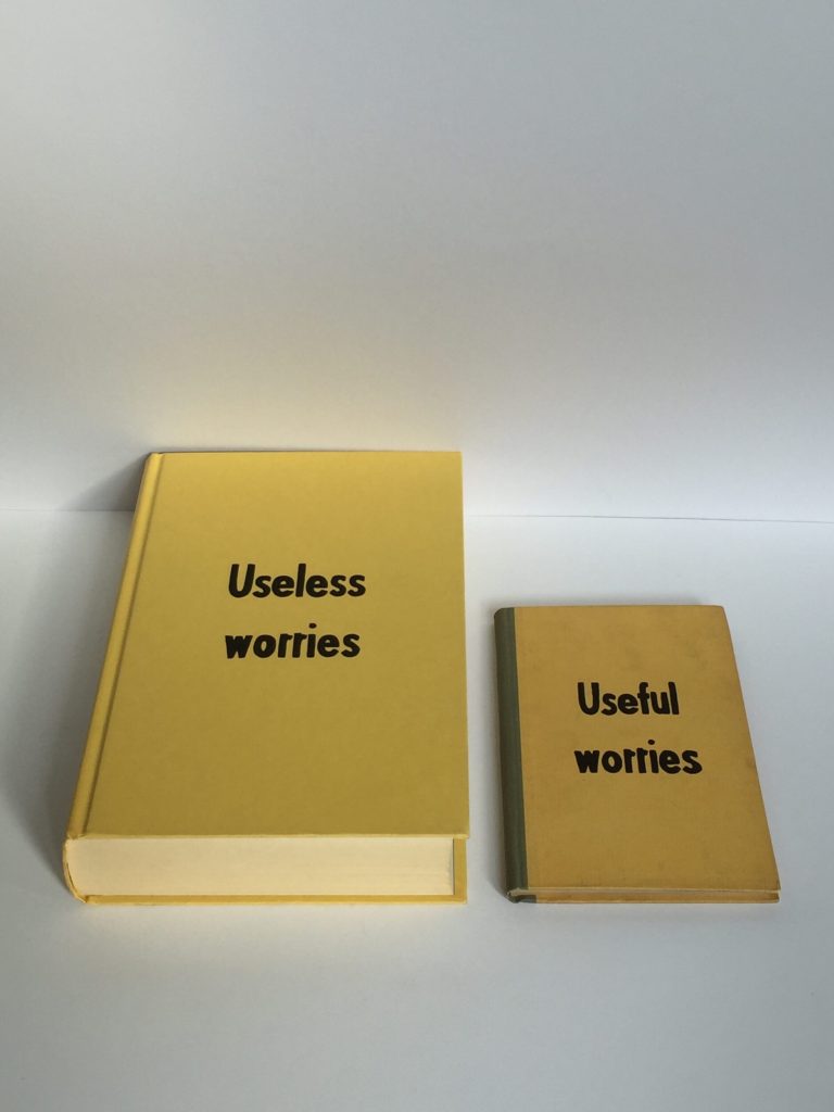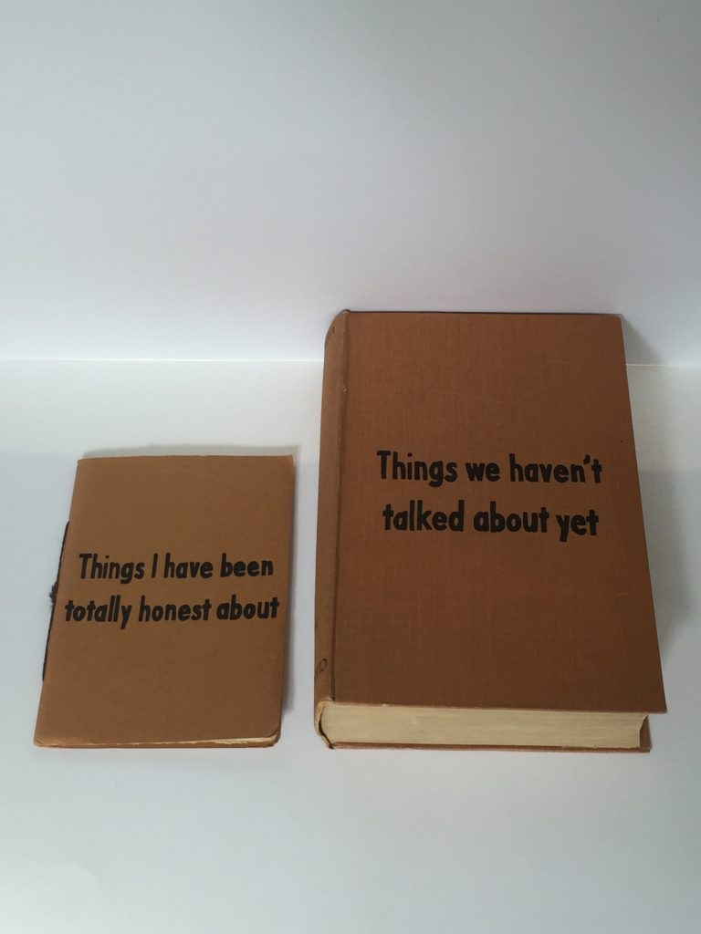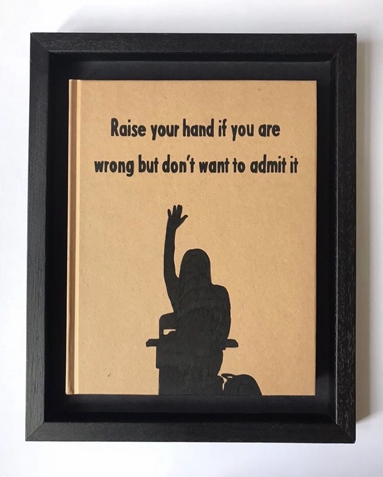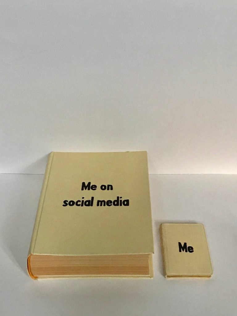 El artista a menudo agrega otra capa de significado a sus piezas yuxtaponiendo libros pequeños y grandes entre sí en forma de dípticos satíricos.