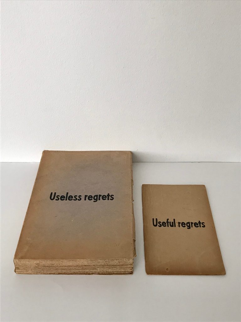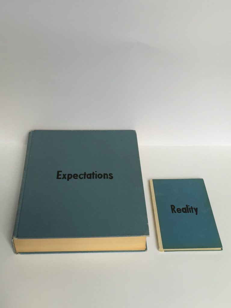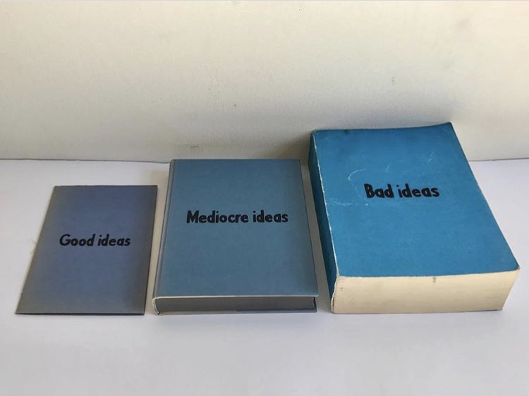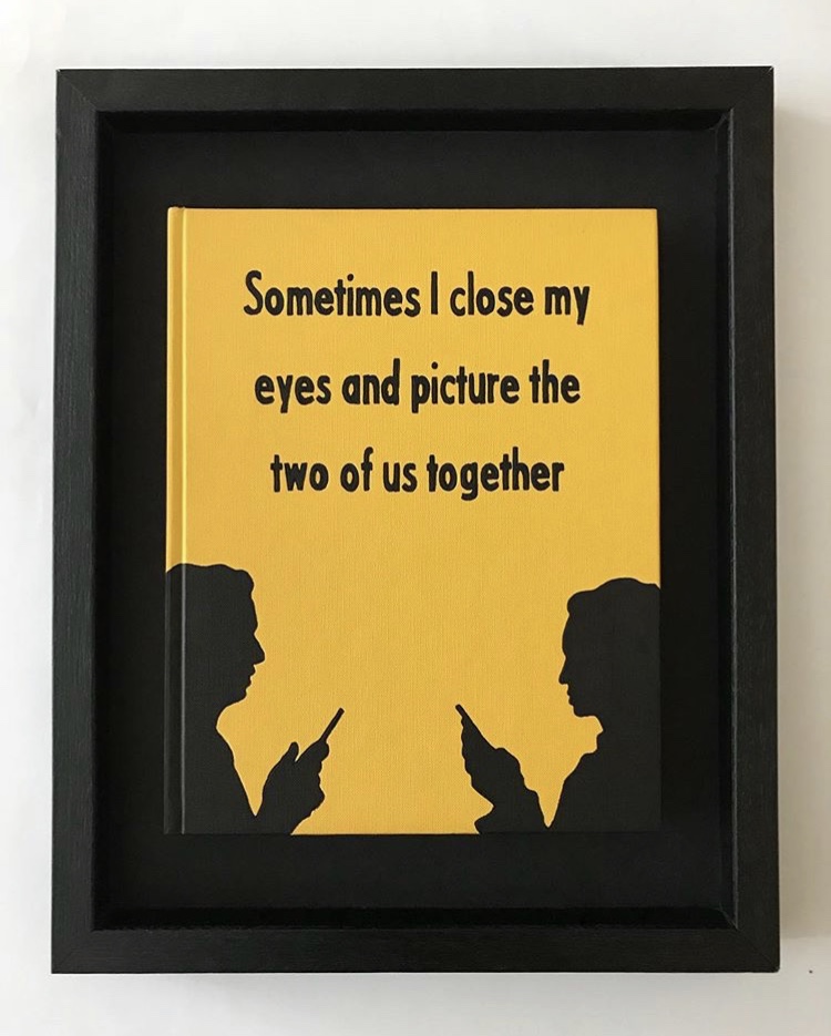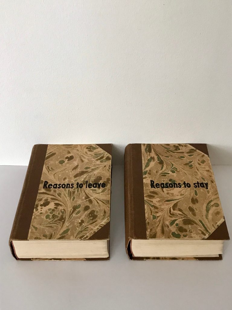El artista a menudo agrega otra capa de significado a sus piezas yuxtaponiendo libros pequeños y grandes entre sí en forma de dípticos satíricos.